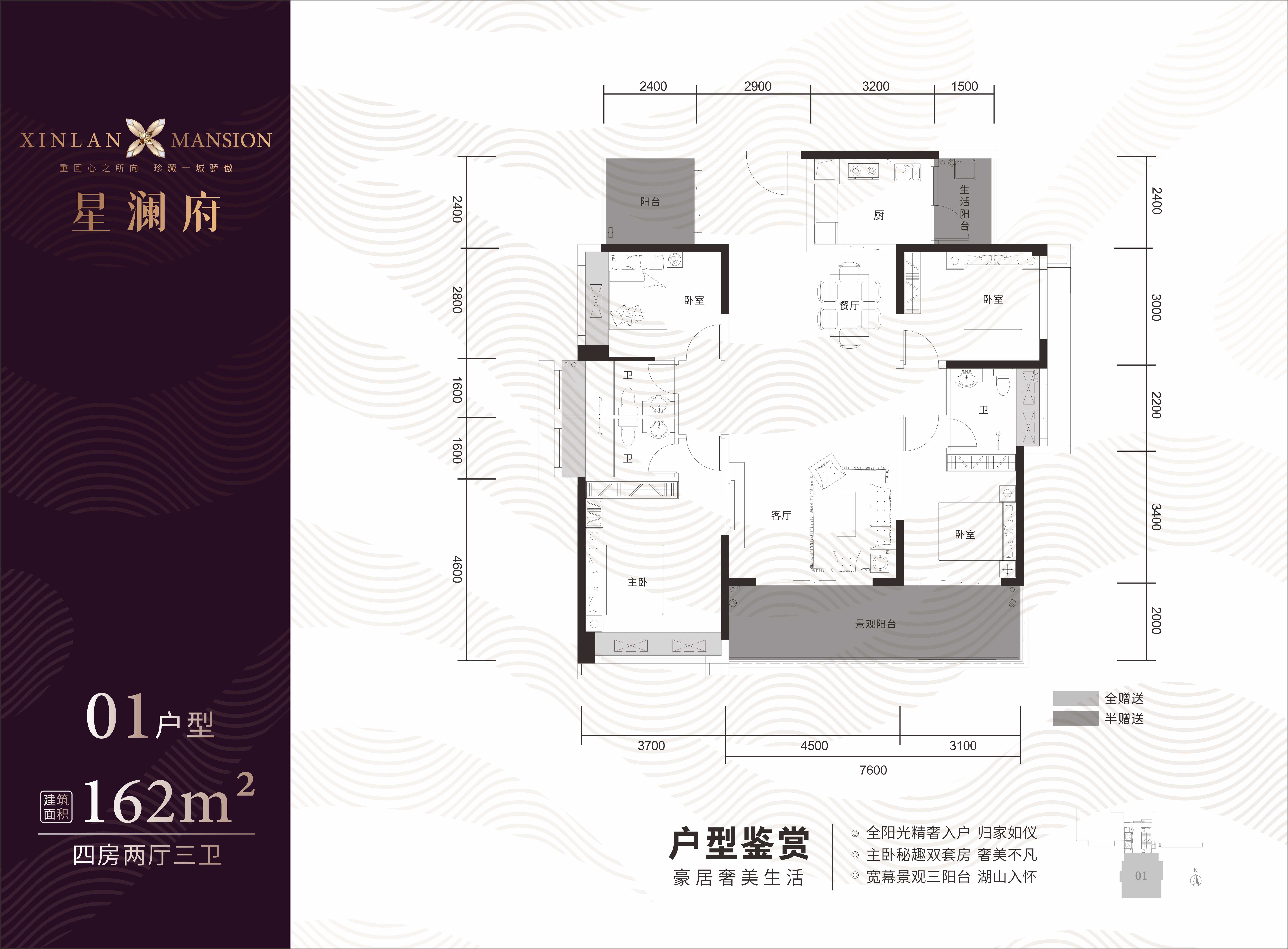 ◎全阳光精奢入户,玄关至厅堂步步生仪,归家即启尊崇礼遇 ◎双套房私藏秘趣天地,奢美不凡格调中,安放尊崇与自在日常 ◎7.6米超幕全景阳台,湖山入画框,茶叙、园艺、观星,生活与风景在此从容交织
